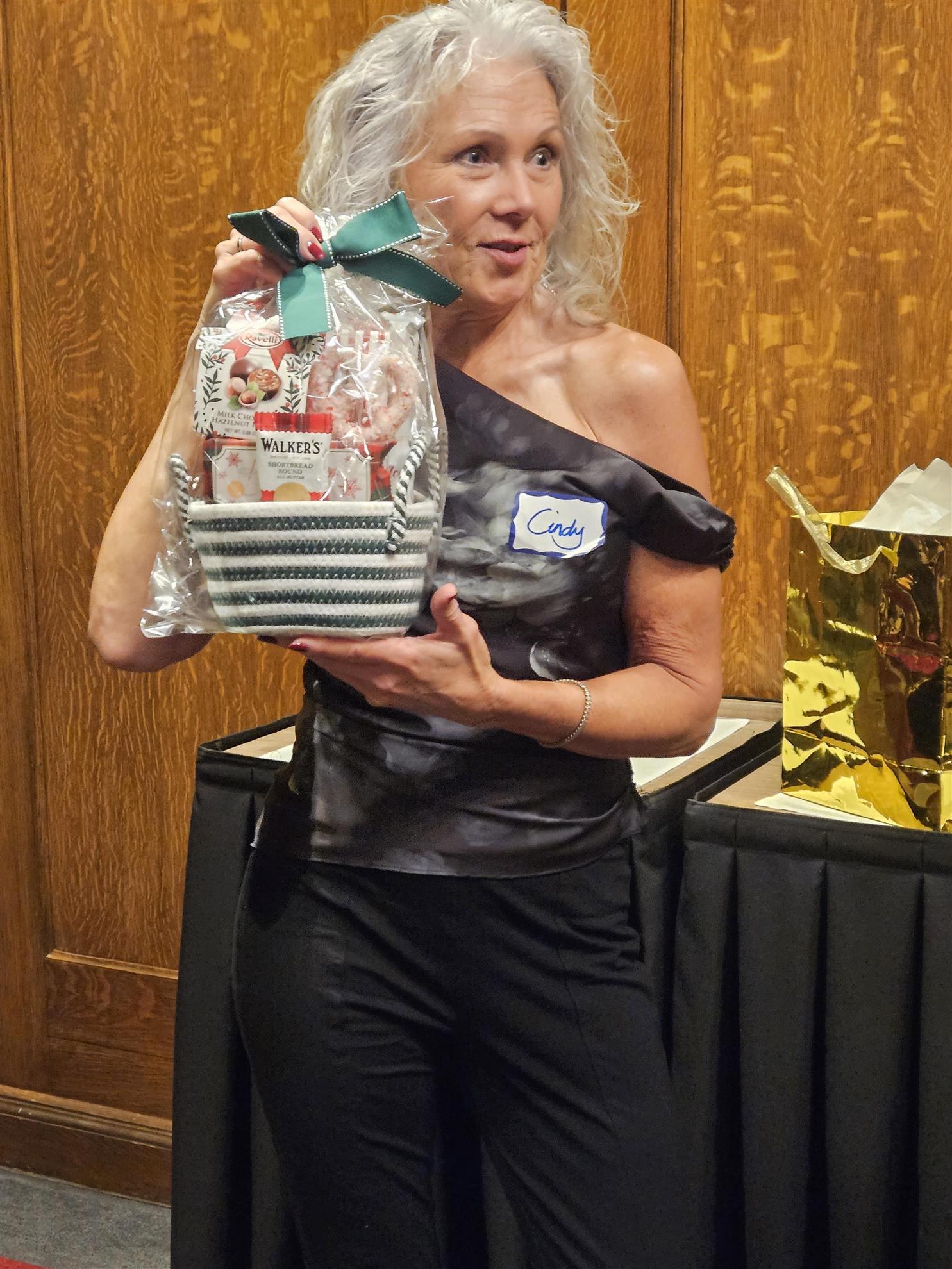 Cindy Fullmer, showing unwrapped gift.